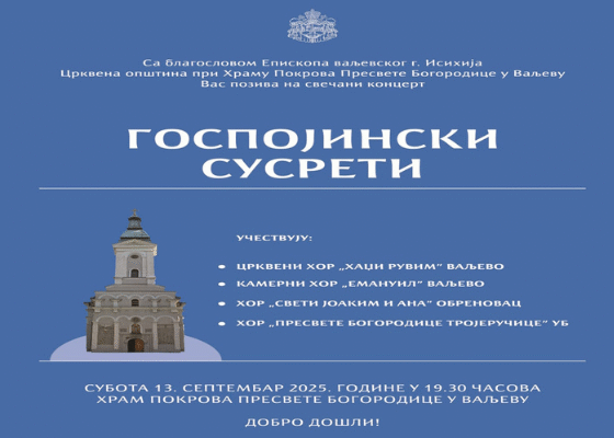 Gospojinski susreti horova biće održani u subotu, 13. septembra 2025. godine, sa početkom u 19:30 časova, u Hramu Pokrova Presvete…